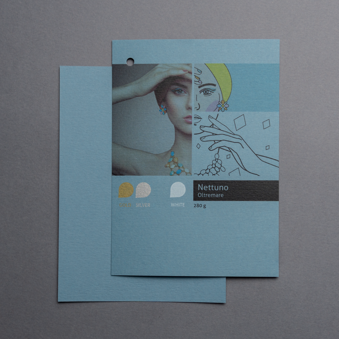 Az FSC® tanúsított, ECF cellulózból gyártott papírt, a nagymúltú (1888-ban alapított) olasz Fedrigoni papírgyár készíti. A Nettuno Oltremare az általunk tartott kevés színes papírok egyike. Finom barázdáltságával, visszafogott szürkéskék színével kiválóan alkalmas kiadványok borítójához, névjegykártyához, meghívóhoz vagy leporellóhoz.