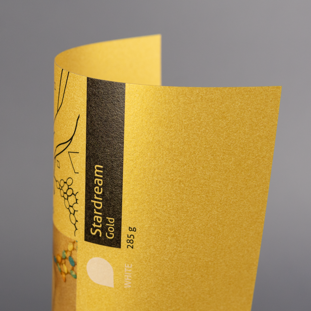 Az arany színű, gyöngyházfényű alapanyag elemi klórmentes és FSC® tanúsítvánnyal rendelkezik. Anyagában színezett, ezért jól biegelhető. Vastagsága miatt ajánljuk meghívókhoz, névjegyekhez, kártyákhoz. A csillogó felületen gyönyörű mélységet kapnak a jól megválasztott világos színek.